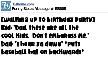 X says [walking up to birthday party] Kid: "Dad, these are all the cool kids. Don't embarass me." Dad: "I hear ya dawg" *puts baseball hat on backwards*