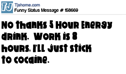 - # 171382 Thanks 5 hour energy drink, but I have to work for 8 hours-not 5. I'll just stick with cocaine.
