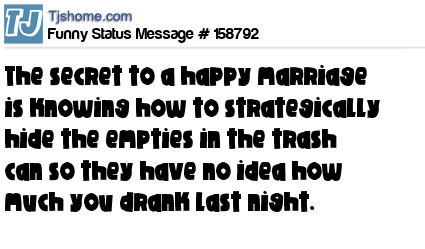 X says The secret to a happy marriage is knowing how to strategically hide the empties in the trash can so they have no idea how much you drank last night.