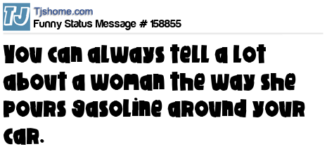 X says You can always tell a lot about a woman the way she pours gasoline around your car.