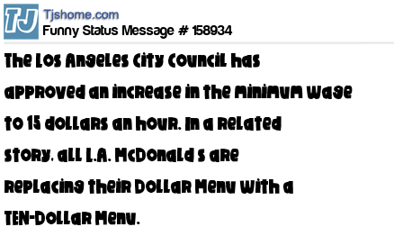 X says The Los Angeles City Council has approved an increase in the minimum wage to 15 dollars an hour. In a related story, all L.A. McDonald’s are replacing their Dollar Menu with a TEN-Dollar Menu.