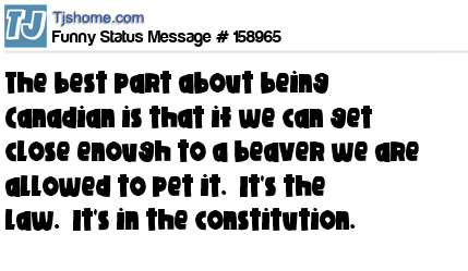 X says The best part about being Canadian is that if we can get close enough to a beaver we are allowed to pet it.  It's the law.  It's in the constitution.