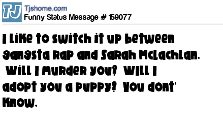 X says I like to switch it up between gangsta rap and Sarah McLachlan.  Will I murder you?  WIll I adopt you a puppy?  You dont' know.