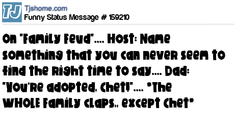 X  On "Family Feud".... Host: Name something that you can never seem to find the right time to say.... Dad: "You're adopted, Chet!".... *The WHOLE Family claps,, except Chet*