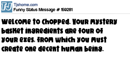 X says Welcome to Chopped. Your mystery basket ingredients are four of your exes, from which you must create one decent human being.