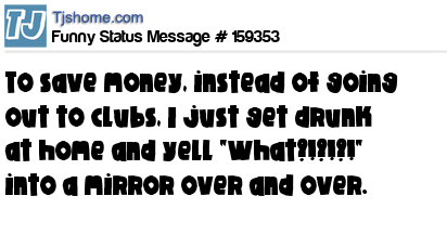 X says To save money, instead of going out to clubs, I just get drunk at home and yell "What?!?!?!" into a mirror over and over.
