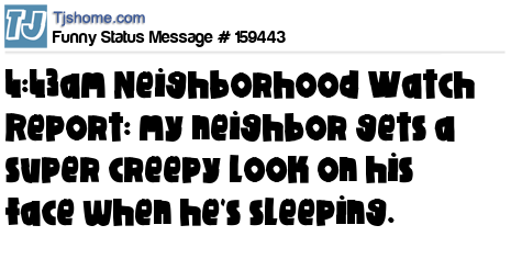 X says 4:43am Neighborhood Watch Report: my neighbor gets a super creepy look on his face when he's sleeping.