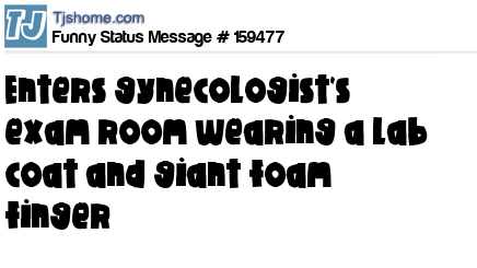 X Enters gynecologist's exam room wearing a lab coat and giant foam finger