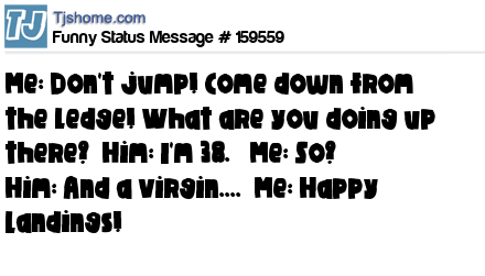 X says Me: Don't jump! Come down from the ledge! What are you doing up there?  Him: I'm 38.   Me: So?  Him: And a virgin....  Me: Happy Landings!