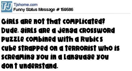 X says Girls are not that complicated? Dude, girls are a jenga crossword puzzle combined with a Rubic’s cube strapped on a terrorist who is screaming you in a language you don’t understand.