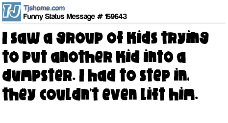 - # 108748 I saw a group of kids trying to put another kid into a dumpster. I had to step in, they couldn't even lift him. We high-fived & laughed.