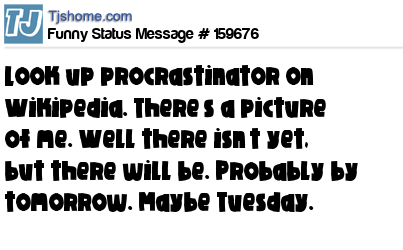 X Look up procrastinator on Wikipedia. There’s a picture of me. Well there isn’t yet, but there will be. Probably by tomorrow. Maybe Tuesday.