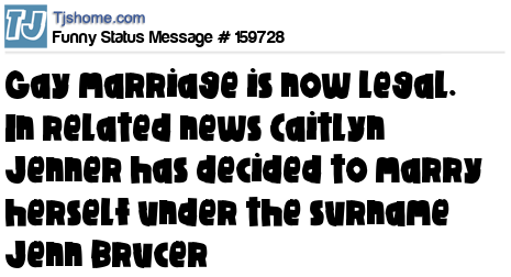 X says Gay marriage is now legal. In related news Caitlyn Jenner has decided to marry herself under the surname Jenn Brucer