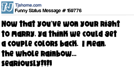 X says Now that you've won your right to marry, ya think we could get a couple colors back. I mean, the whole rainbow... seariously?!?!