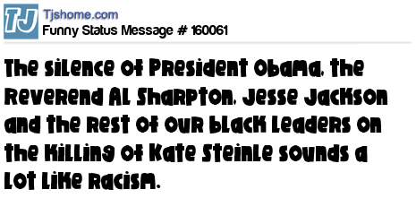 X says The silence of President Obama, the Reverend Al Sharpton, Jesse Jackson and the rest of our black leaders on the killing of Kate Steinle sounds a lot like racism.
