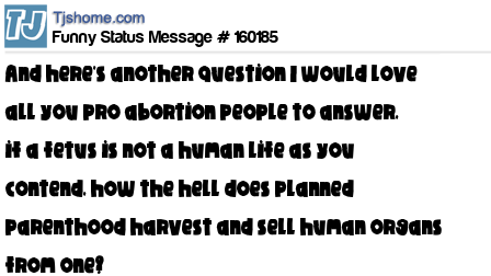 X says And here's another question I would love all you pro abortion people to answer, if a fetus is not a human life as you contend, how the hell does planned parenthood harvest and sell human organs from one?