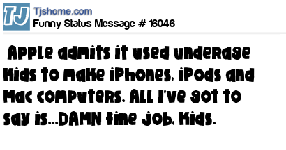 X is Apple admits it used underage kids to make iPhones, iPods and Mac computers. All I've got to say is...DAMN fine job, kids.