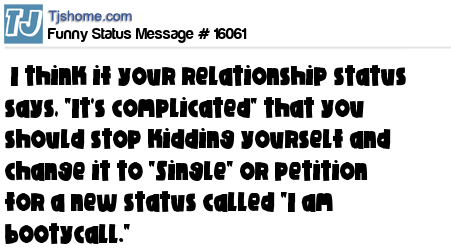 X says I think if your relationship status says, "It's complicated" that you should stop kidding yourself and change it to "Single" or petition for a new status called "I am bootycall."