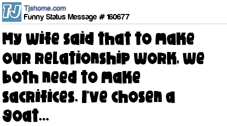X My wife said that to make our relationship work, we both need to make sacrifices. I've chosen a goat...