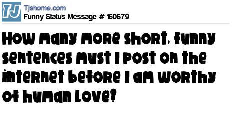 X How many more short, funny sentences must I post on the internet before I am worthy of human love?