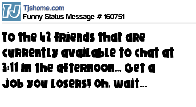 X To the 42 friends that are currently available to chat at 3:11 in the afternoon... Get a job you losers! Oh, wait...