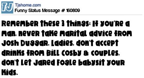 X says Remember these 3 things: If you're a man, never take marital advice from Josh Duggar. Ladies, don't accept drinks from Bill Cosby & couples, don't let Jared Fogle babysit your kids.