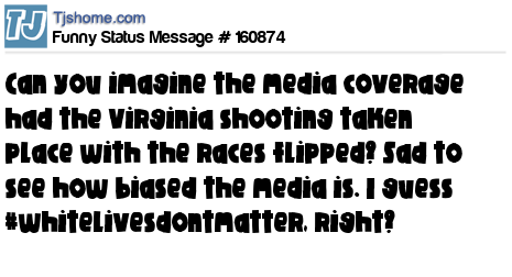 X  Can you imagine the media coverage had the Virginia shooting taken place with the races flipped? Sad to see how biased the media is. I guess #whitelivesdontmatter, right?