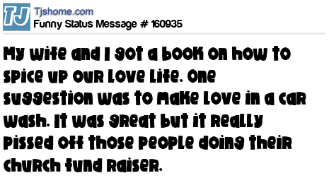 X says My wife and I got a book on how to spice up our love life. One suggestion was to make love in a car wash. It was great but it really pissed off those people doing their church fund raiser.