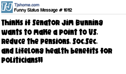 X thinks if Senator Jim Bunning wants to make a point to US, reduce the pensions, Soc.Sec. and lifelong health benefits for politicians!!