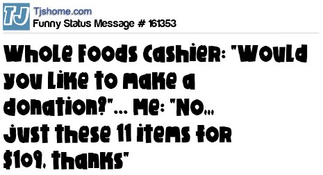 X Whole Foods Cashier: "Would you like to make a donation?"... Me: "No,,, just these 11 items for $109, thanks"