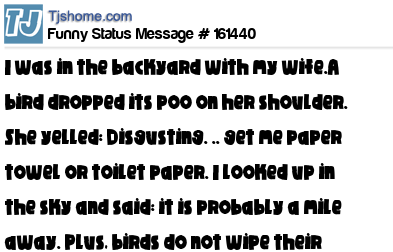 X I was in the backyard with my wife.A bird dropped its poo on her shoulder. She yelled: Disgusting. .. get me paper towel or toilet paper. I looked up in the sky and said: it is probably a mile away. Plus, birds do not wipe their aasss.