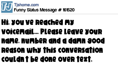 - # 159367 Hi you've reached my voicemail,,, Please leave your name, number and a damn good reason why this conversation couldn't be done over text