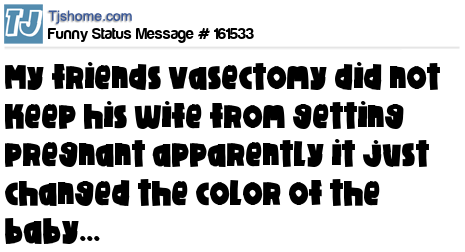 X says My friends vasectomy did not keep his wife from getting pregnant apparently it just changed the color of the baby...