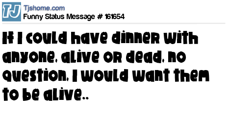 - # 105613 If I could have dinner with anyone, dead or alive, I would choose alive,,, because eating with dead people is just creepy.