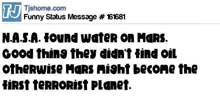 X says N.A.S.A. found water on Mars. Good thing they didn't find oil otherwise Mars might become the first terrorist planet.