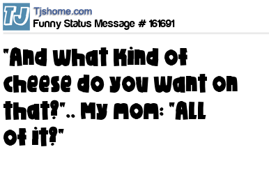 X says "And what kind of cheese do you want on that?".. My mom: "All of it?"