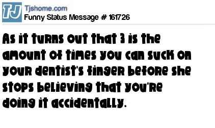 - # 144111 It turns out that 3 is the amount of times you can suck on your dentist's finger before she stops believing that you're doing it accidentally.