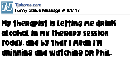 X says My therapist is letting me drink alcohol in my therapy session today, and by that I mean I'm drinking and watching Dr Phil.