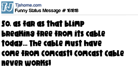 X says So, as far as that blimp breaking free from its cable today... The cable must have come from Comcast! Comcast Cable never works!