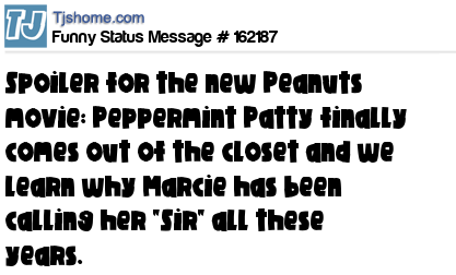 X says Spoiler for the new Peanuts movie: Peppermint Patty finally comes out of the closet and we learn why Marcie has been calling her "Sir" all these years.