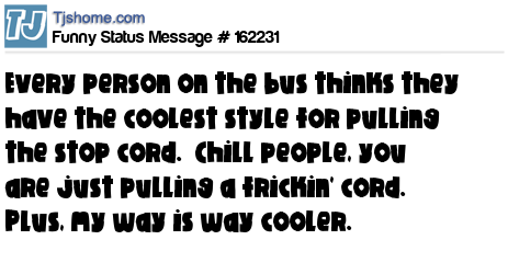 X  Every person on the bus thinks they have the coolest style for pulling the stop cord.  Chill people, you are just pulling a frickin' cord.  Plus, my way is way cooler.