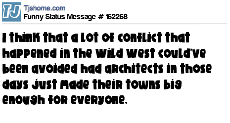 - # 143780 I believe a lot of conflict in the Wild West could have been avoided if the Old West architects had just made their towns big enough for everyone.