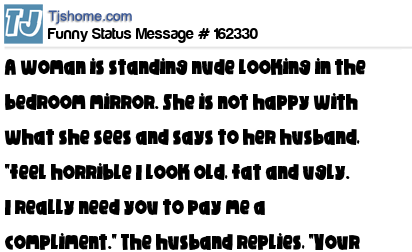 X says A woman is standing nude looking in the bedroom mirror. She is not happy with what she sees and says to her husband, "feel horrible I look old, fat and ugly. I really need you to pay me a compliment." The husband replies, "Your eyesight's damn near perfec