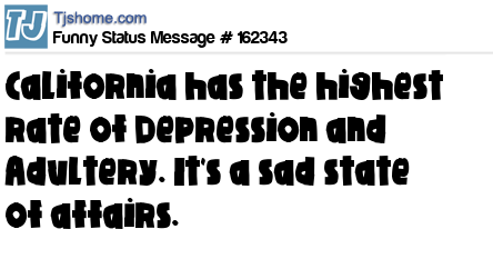 - # 140548 Apparently, California has the highest rate of Adultery and Depression. It's a sad State of affairs....