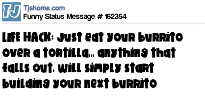 X says LIFE HACK: Just eat your burrito over a tortilla,,, anything that falls out, will simply start building your next burrito
