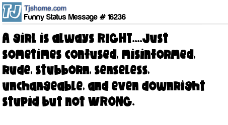 X  A girl is always RIGHT....Just sometimes confused, misinformed, rude, stubborn, senseless, unchangeable, and even downright stupid but not WRONG.