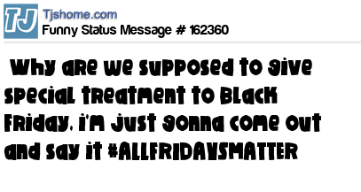 X says Why are we supposed to give special treatment to Black Friday, i'm just gonna come out and say it #ALLFRIDAYSMATTER