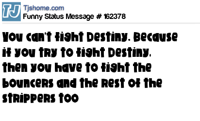 - # 162110 You can't fight Destiny. Because if you try to fight destiny then you have to fight the bouncers and the rest of the strippers too.