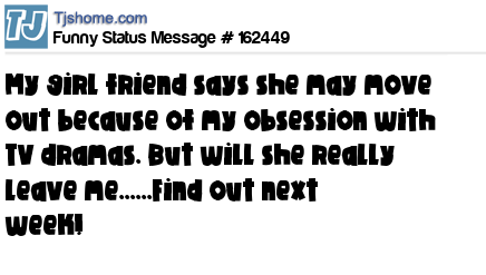 X says My girl friend says she may move out because of my obsession with TV dramas. But will she really leave me......Find out next week!