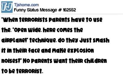 - # 162527 When terrorists parents have to use the, "Open wide, here comes the airplane!" technique, do they just smash it in their face and make explosion noises?